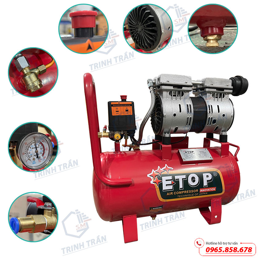 Máy nén khí Etop có công tắc áp suất và van an toàn, tự động ngắt sau khi nạp đầy khí giúp đảm bảo an toàn cho người sử dụng.